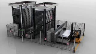 Věžový skladovací systém plechů Remmert BASIC Tower - dvojitá věž s příčnou stanicí