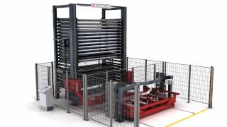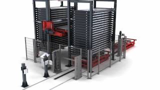 Věžový skladovací systém plechů Remmert BASIC Tower - jednoduchá věž s příčnou stanicí